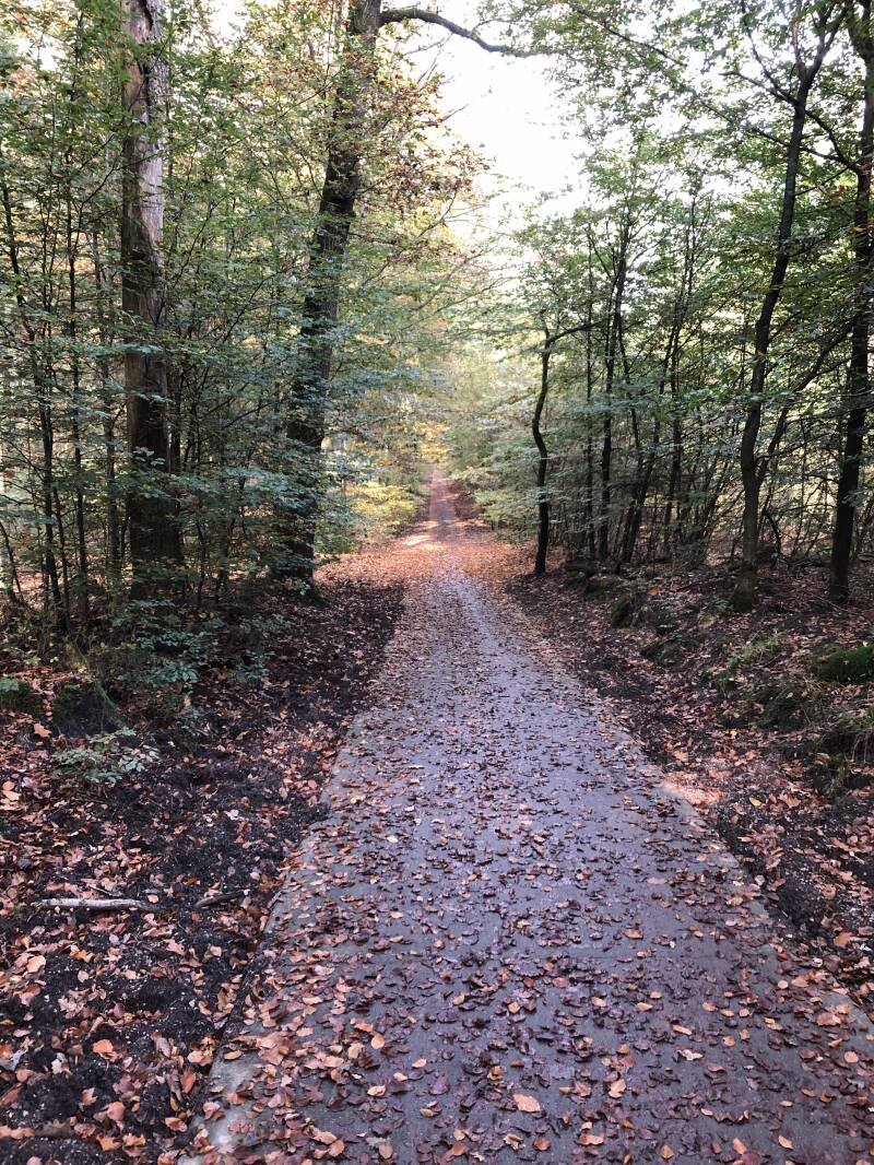 Op het fietspad liggen heel veel bladeren maar we konden lekker door fietsen, tot we een bezemwagen voor ons hadden die alle blaadjes van de weg haalde. De Veluwe heeft heel veel verschillende gezichten om van te genieten, zelf in de bijna herfst.