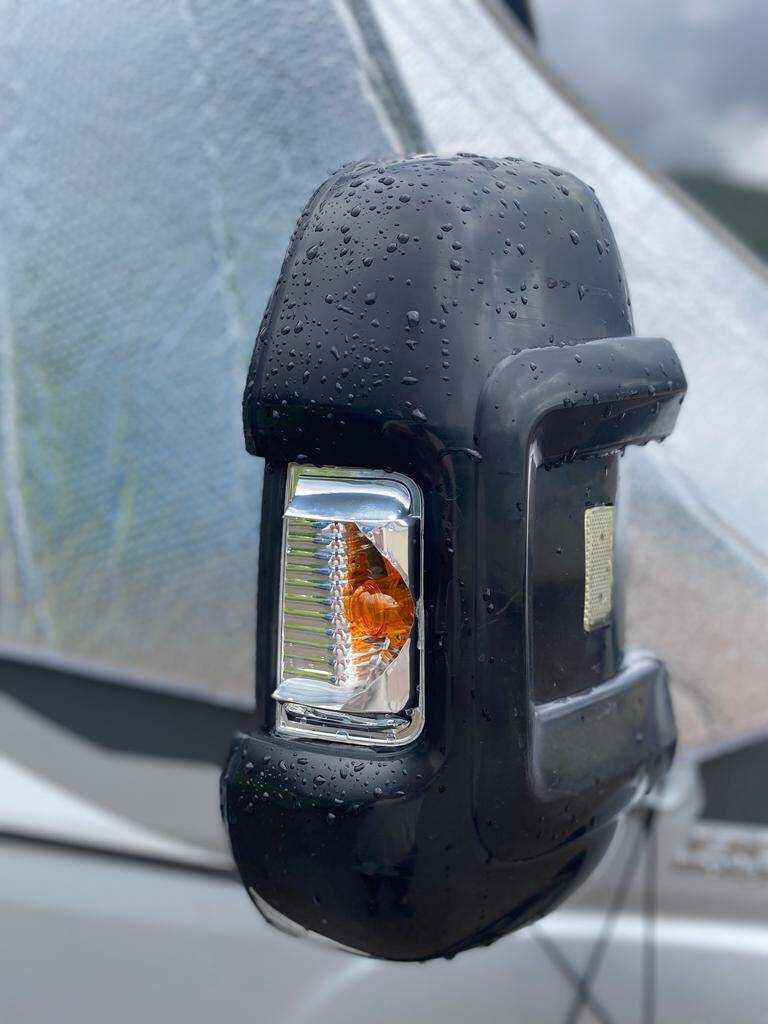 De weg word smaller en het verkeer drukker of misschien moet ik zeggen meer gehaast. Het weer is slecht, het zicht is slecht en het zijn vooral hele smalle wegen met veel bochten. Er komen veel vrachtwagens en campers ons tegenmoet en op een gegeven moment horen we een flinke klap en zie ik iets van onze camper wegvliegen in de spiegel. Een Duitse camper raakt onze spiegel en we zijn het afdek kapje van het knipperlicht in de spiegel kwijt.