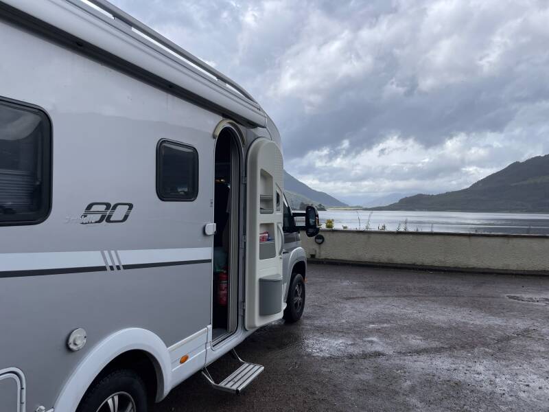 Marco bemerkt dat de Victron omvormer veel geluid maakt, dat zou kunnen omdat we net de fietsaccu's op de lader hebben gezet, edoch blijkt dat we helemaal geen walspanning hebben, alles schakelaars in de camper gecheckt, alles staan goed dus moet er van de stroompaal geen spanning komen, en inderdaad, hier lag, bij ons en de buurman, de aardlek schakelaar eruit. Klep opgemaakt om te resetten, zonder resultaat dus maar even naar de receptie om dit te melden. Na nog geen vijf minuten stond de campingbaas al bij de paal en legde uit dat de aardlek schakelaar eerst door een borging naar beneden geduwd moet worden en dan omhoog. Hij vertelde dat hij de eerste keer hier een elektricien uit het dorp voor had laten komen. Was een nieuw type schakelaar. Afijn, lang verhaal kort, we hebben weer stroom, het prachtige zicht van Loch Leven wordt verruild voor een binnenkomende regenbui ( het is alsof er een wolk van tussen de bergen naar beneden komt), fietsen staan op de fietsendrager, het is heerlijk warm in de camper, straks lekker steengrillen en vanavond gaan we het WK Rummikub Glencoe houden en voor de rest.... doen helemaal niets meer vandaag!