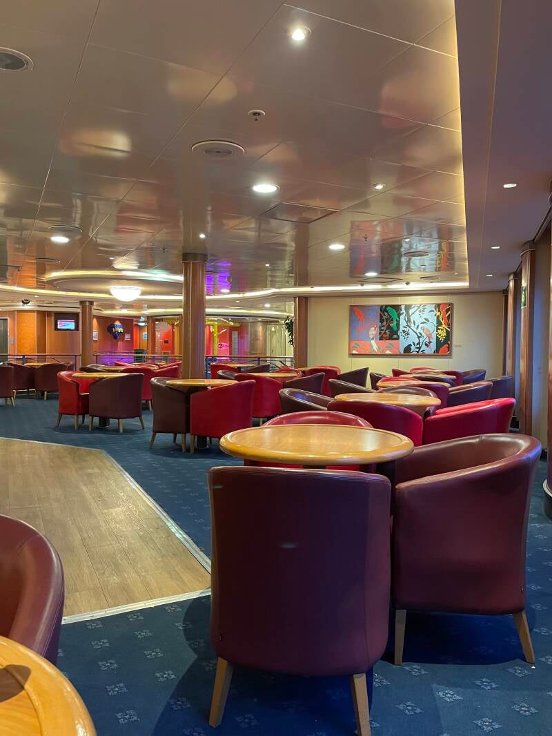 De laatste nacht van onze vakantie zit erop, we schommelen nog heen en weer en het is super warm in de hut (airco op standje invriezen hielp niet). Ik ga om 5 uur douchen en naar de koffie bar, Marco blijft nog even liggen in de hoop dat hij nog even in slaap valt. Het is nog stil aan boord en ik zoek een hoekje om rustig te zitten en wat af te koelen. Met mijn boek in handen zie ik dat het leven aan boord langzaam op gang komt. De koffie corner gaat open en ik bestel een Latte. Om 6 uur (Engelse tijd) wordt er om geroepen dat het 7 uur is en dat het ontbijt- buffet geopend is. 5 minuten later komt Marco met al onze spullen aanzetten. Klaar wakker en tijd voor koffie.