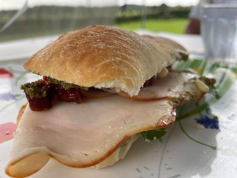 Er is een heerlijk windje en dat koelt de boel een beetje af, we hadden nog niet ontbeten dus eerst maar snel een broodje in de oven. Andrea had al koffie gezet dus ons ontbijt was compleet.
