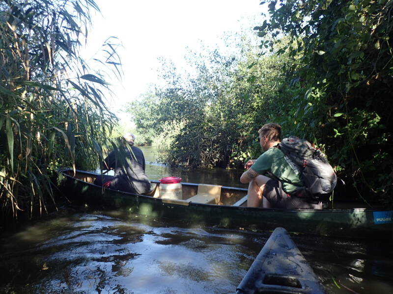 We hebben per boot een waterdichte ton bij met onze lunch en heel veel drinken, want de temperatuur zou oplopen tot maximaal 30 graden. Gelukkig viel dit reuze mee, op het water is het toch wat koeler en er was redelijk wat bebossing langs de dommel zodat we veel in de schaduw aan het varen waren. Het is druk op de route maar we varen elkaar eigenlijk niet in de weg, op een enkeling na uiteraard. We hebben regelmatig contact met de bosjes aan de zijkant van de Dommel en we hebben bijna iedere zandbank wel gehad maar wat hebben we gelachen onderweg.