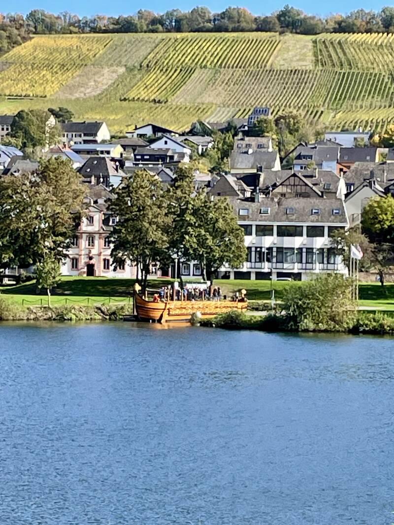Aan deze kant van de Moezel moeten we wat vaker de dorpen in en zelf een stuk het water over en aan de andere kant (die we op de heen weg al hadden gehad) omdat het hier behoorlijk heuvelachtig is.