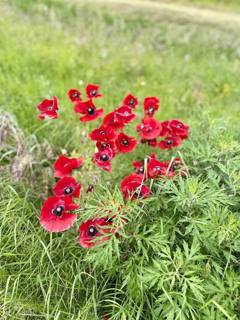 We rijden door naar de camping, op een smalle weg stoppen we en ik loop naar de receptie die niet bij de ingang is van de camping maar bij het pannenkoekenhuis. Ik wordt vriendelijk ontvangen en krijg alle info mee voor zowel onszelf als voor opa. Met de keycard kunnen we de camping op en vinden al snel ons plekje. We staan op een klein veldje met zo'n 3 grote caravans en nog 4 plekken vrij. We parkeren de camper en manoeuvreren opa op zijn plek. In de tussentijd dat Marco zijn vader helpt sluit ik de camper aan en zorg dat de stoelen en tafel buiten staan. Als alles zo'n beetje klaar is, is het tijd voor koffie, het zonnetje schijnt heerlijk en we genieten van de rust. Jet wordt wat ongeduldig en wil eigenlijk vlammen, ik ga daarom maar even een rondje doen. Net bij de ingang van de camping is een klein paadje tussen de bomen dat naar een hondenuitlaat plek komt, ik loop er door heen en kom op een brede strook gras die langs de achterkant van de huizen naar de ingang van het chalet park loopt. Een lekker stukje waar ze even kunnen rennen. Veel puf hebben ze eigenlijk niet door de hitte en komen al snel naast me lopen. Op het einde draaien we om en lopen terug naar de camper.