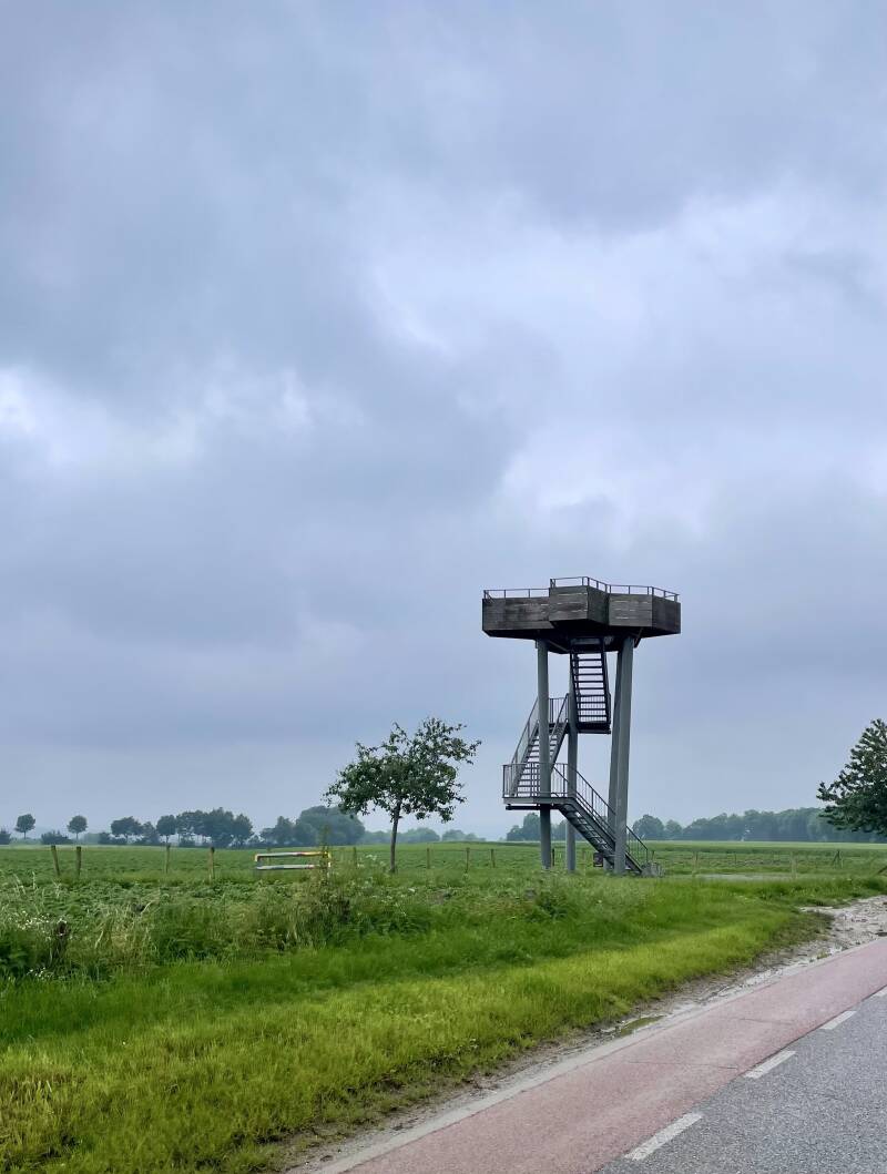 Zondag ochtend, de honden beginnen wat ongeduldig te worden dus ik ga even een rondje lopen. Als ik eenmaal op de weg ben loop ik over een te glad stukje waar ik even lekker onderuit ga en val zo op mijn heup.......@#$%^&^%$#@. Een aardige Duitse dame houdt de honden vast zodat ik op kan staan. Ik loop nog een stukje door en draai dan om, mijn gevoel zegt dat ik morgen een blauwe zijkant heb. Maar goed eerst lekker ontbijten, daarna nog een rondje fietsen met de honden. Jet springt als een dolle naast de fiets, ze is helemaal blij dat ze nog mee mag. We fietsen langs een uitkijk toren waar ik toch nog even naar boven ga, Jet en Tess vonden dat maar gek en Jet was zo stoer dat ze ook de trap op ging. We volgen knooppunt 100 en komen uit in Mesch vandaar uit gaan we weer terug naar de camping en deze keer pakken we de verharde weg en geen bospad.