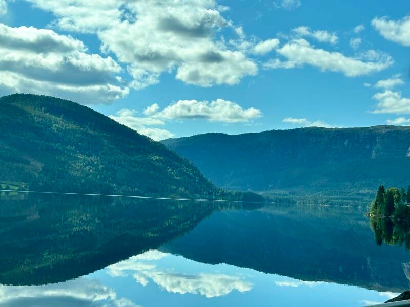 We rijden op het gemakje door en komen onderweg ook nog een dam tegen maar de camping is niet meer zover en hier kunnen we wel op de fiets naar toe. Even een route maken in route.nl dan zien we gelijk of er fietspaden zijn of dat we op de weg moeten fietsen. 10 minuten later sta ik in de receptie van de Odden camping in Evie, een vriendelijke man staat me te woord en na alle gegevens te hebben genoteerd haal ik mijn pas door de automaat en kunnen we een plekje uitzoeken. Weer een kijk maar waar je wil gaan staan, nou en dat doen we dan ook en vinden een mooi plekje aan de waterkant. Volgens de kenner is de rivier waar we aan staan de warmste in Noorwegen, maar dat hebben we al eens eerder gehad in Grimstad🥶