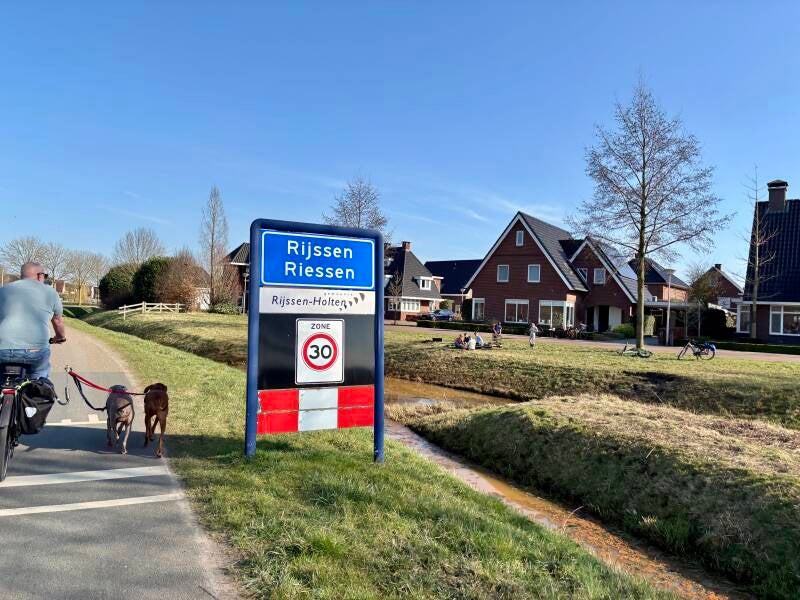 Vandaag een lange rit voor de boeg en we kunnen pas laat weg omdat Marco om half vier nog een medische keuring (uiteraard goed gekeurd) had voor zijn tweede carrière. We vertrokken om 16:15 uur en moesten 270 km afleggen, in de spits, dus 3,5 uur en 4 files later komen we aan in Rijssen. We konden zo doorrijden omdat de slagboom nummerplaat herkenning had, nog even snel inchecken voor de stroom en hup naar onze plek. Eerst even snel met de honden naar de uitlaat plek, want dat is super ideaal hier een eigen hondenlosloopplaats helemaal omheind, wel even de poep opruimen!