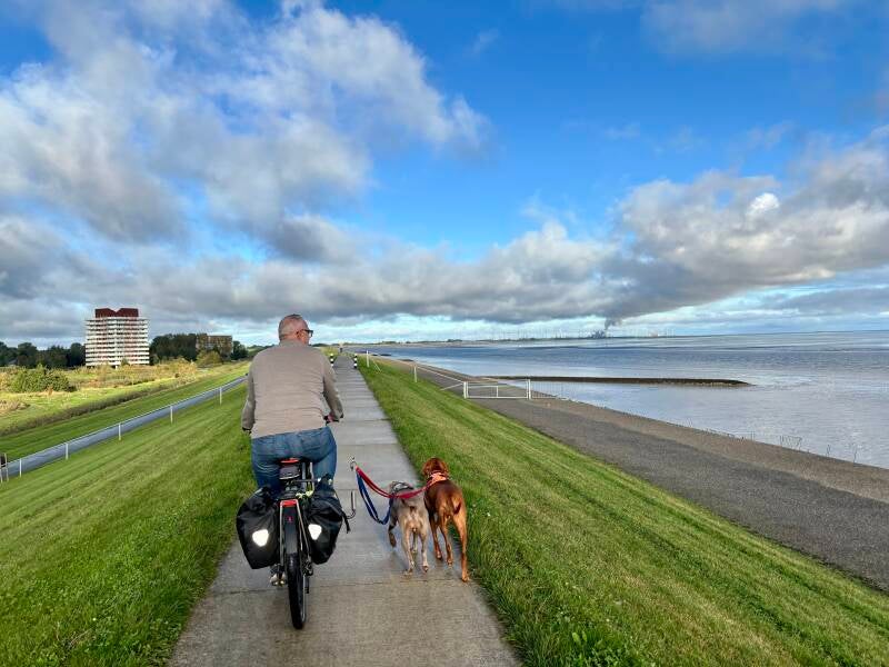 We begrijpen even later ook waarom we niet met honden op dit terrein mogen, het stikt er van de schapen. Jut en Jul in de cabrio vinden het allemaal prima en genieten van het uitzicht zonder enige vorm van jachtinstinct razen we langs de schapen. Marco houdt wat afstand omdat het vol ligt met schapen poep wat om je oren vliegt. Maar wel leuk om te fietsen over de dijk en een prachtig uitzicht op de Eemshaven en alle industrie die daarbij hoort, aan de overkant zien we Duitsland met windmolens. Geen moment verveling dus.