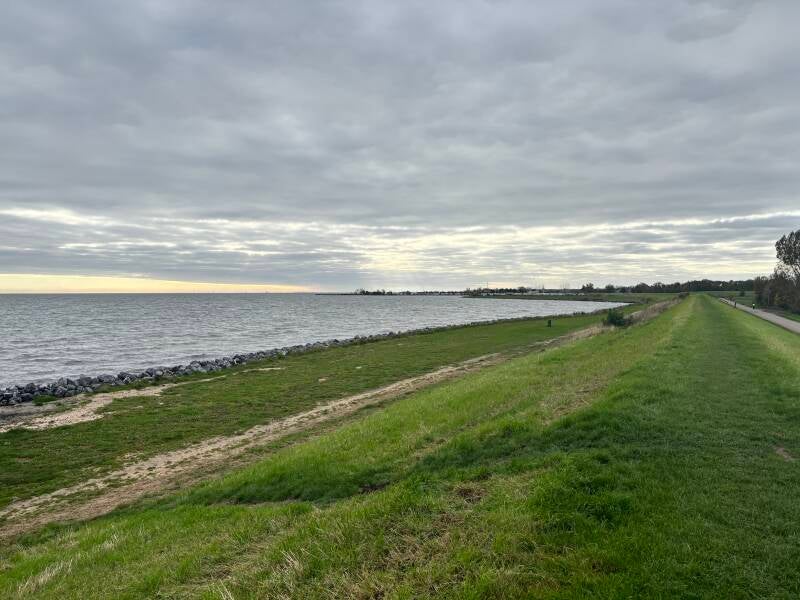 Hoe langer we weg zijn hoe later we wakker worden, vandaag werden we weer gewekt door het gekwetter van de eenden maar inmiddels was het al kwart voor negen dus tijd om op te staan. Na wat te telefonen en een bakje koffie ga ik met de honden naar de dijk en kunnen ze even rennen, als ik terug loop heeft Marco de tafel al gedekt en staan de eitjes in de eierkoker te wachten. Na het ontbijt ga ik even naar het sanitair gebouw en neem gelijk de vuilnis mee en ineens zie ik rechts in mijn ooghoek een mini-kinderboerderij met alpaca's en ander klein vee. Dit was me nog niet opgevallen in de dagen hiervoor.