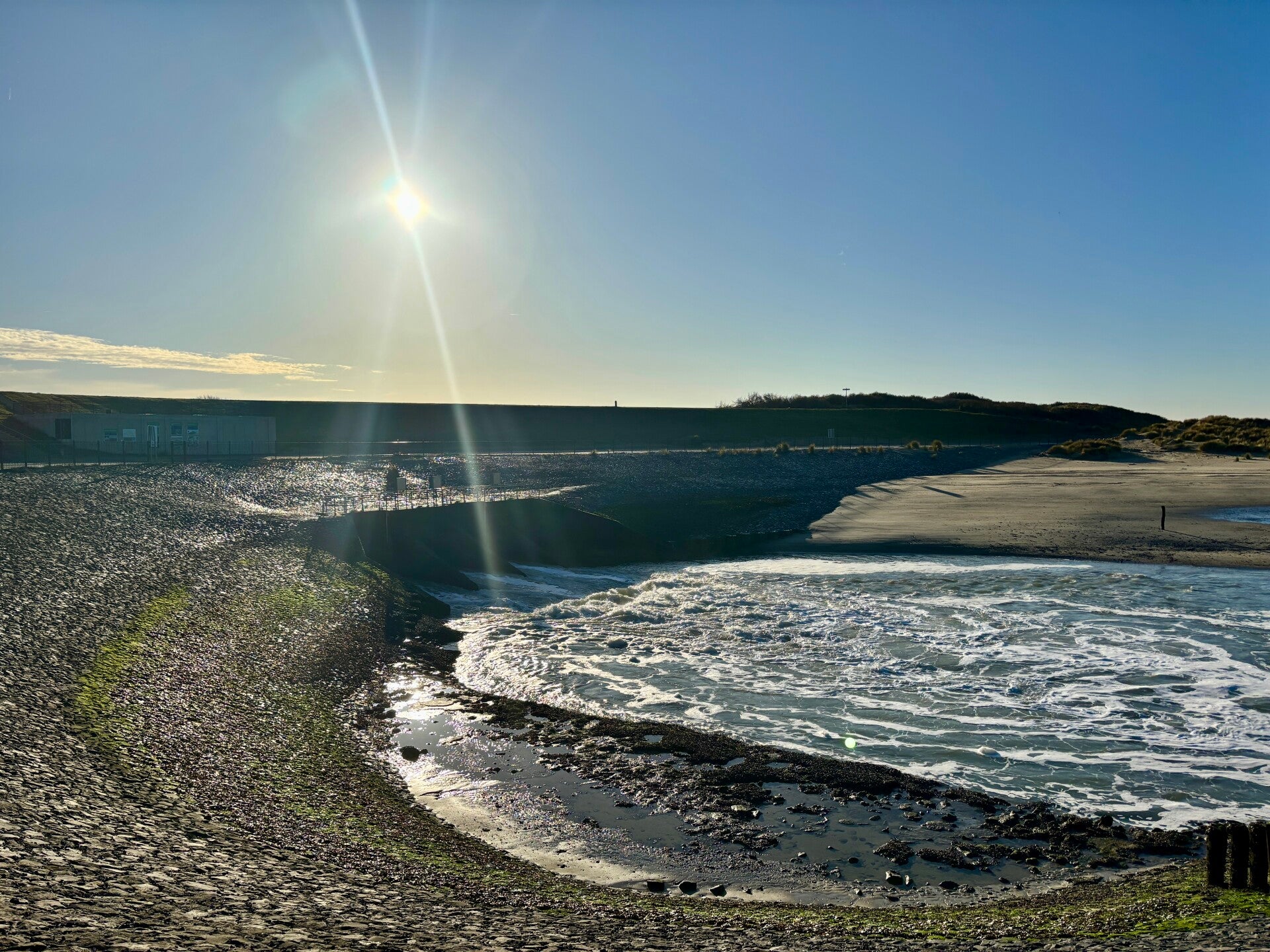 Zondagochtend zijn we wat aan de late kant en voor dat we ons ontbijtje op hebben is het al half elf en om elf uur moeten we weg zijn, snel nog even lozen tegen over het sanitair gebouw en dan zijn we weer weg.