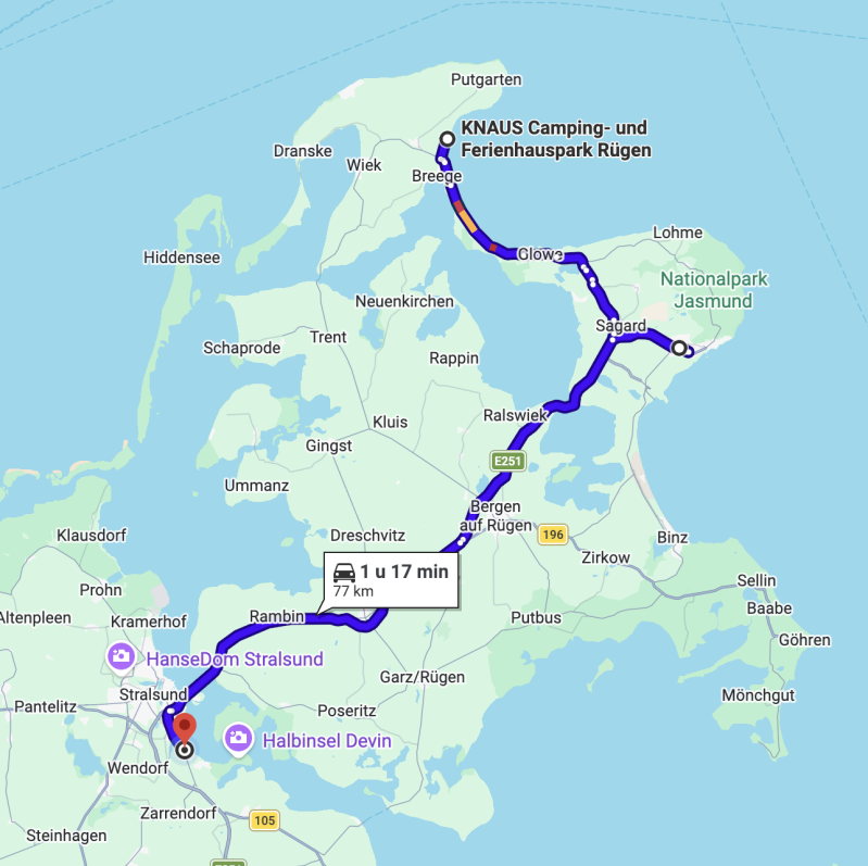 We zetten de camper op een parkeerplaats neer en gaan even het dorp in, het weer begint al donkerder te worden en we houden het snel voor gezien en rijden dan door naar de volgende camperplaats in Stralsund, in totaal 77 kilometer rijden dus prima te doen. Als we 5 minuten in de auto zitten gaat het regenen en volgens buienradar stopt het pas morgenochtend om 04:00 uur dus we hebben nog even.