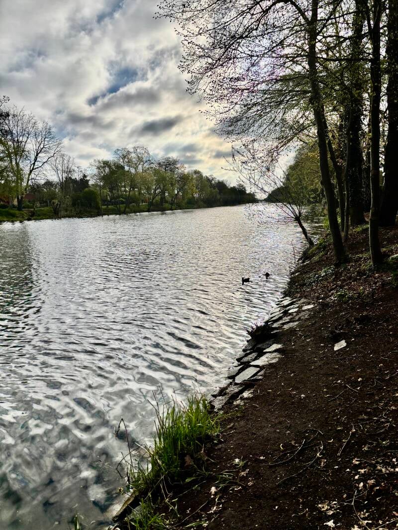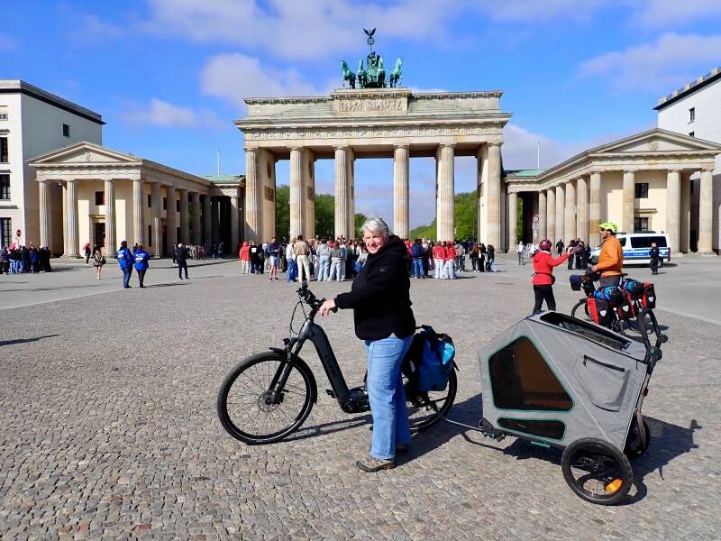 Berlijn slaapt nog als ik met de honden aan het wandelen ben, wat een rust is er hier. We starten dit keer met de honden in de cabrio want ook zij zijn al een paar dagen op pad en beginnen allerlei spierpijntjes te krijgen. We gaan de camping rechts af de brug over en dan weer rechts, we fietsen aan de overkant van het water en zien onze camper staan. Ze vinden toch dat ze willen rennen en dus haalt Marco ze uit de cabrio en kunnen ze nog even knallen voor de drukte van de stad eraan komt.