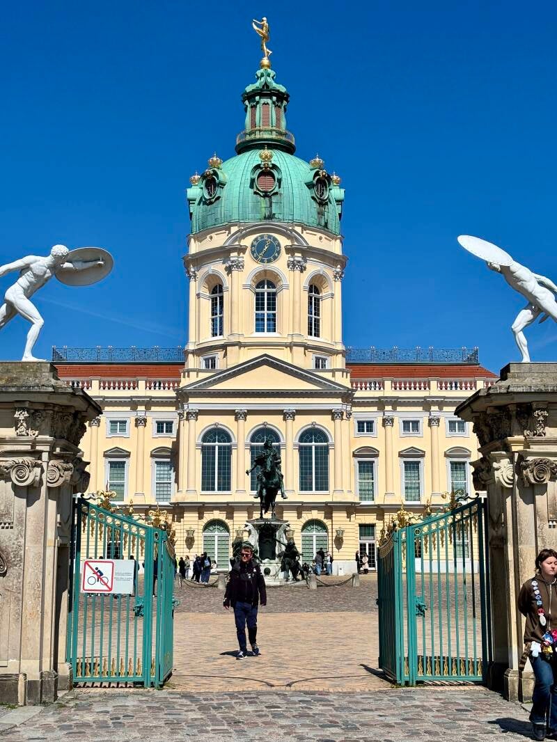 Inmiddels ben ik in en in koud en wil wel weer terug naar de warme camper, maar niet voordat we nog Charlottenburg Paleis hebben gezien, het grootse paleis van Berlijn het zomerhuisje van de koning van Pruisen van 1701-1888. Om het hele paleis stonden hekken omdat er groot onderhoud gepleegd wordt, maar de vooringang was nog wel open en konden we even naar binnen gluren.