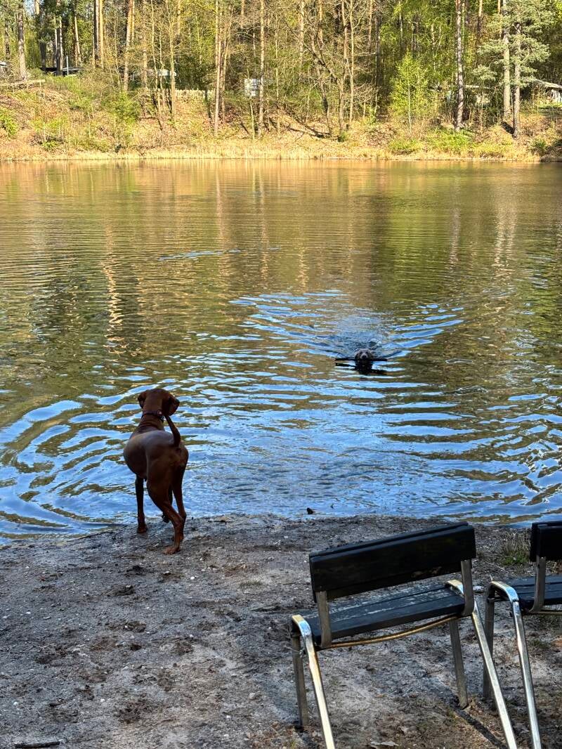 Deze was al gereserveerd dus geen probleem met inchecken, we krijgen een mooi plekje en als Marco alles aansluit ga ik een rondje doen met de honden. We staan aan de rand van een bos maar op de camping is een honden loop rondje van ongeveer 10 minuten waar onderweg een hondenstrand is en dat vonden ze helemaal leuk, met twee natte honden kom ik terug bij Marco. Ik leg ze even buiten in de zon zodat ze drogen, wij zetten de stoelen en de tafel buiten en gaan nog even van het mooie weer genieten, back to nature HEERLIJK!