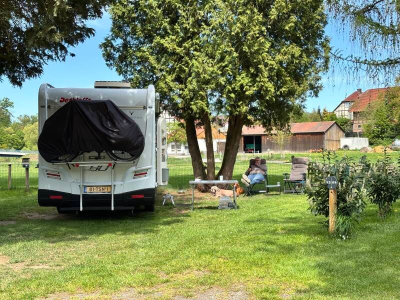 De weg naar de camping is nog ongeveer 60 kilometer en vooral snelweg. Dus eigenlijk zijn we er zo, het laatste stuk is door een klein dorp heen en de zitten dan ook aan het eind van het dorp na de camping is niets meer. We staan in de lus van een rivier Fulda en er is een brug net voor de camping dus er komen alleen wat verdwaalde vissers voorbij.