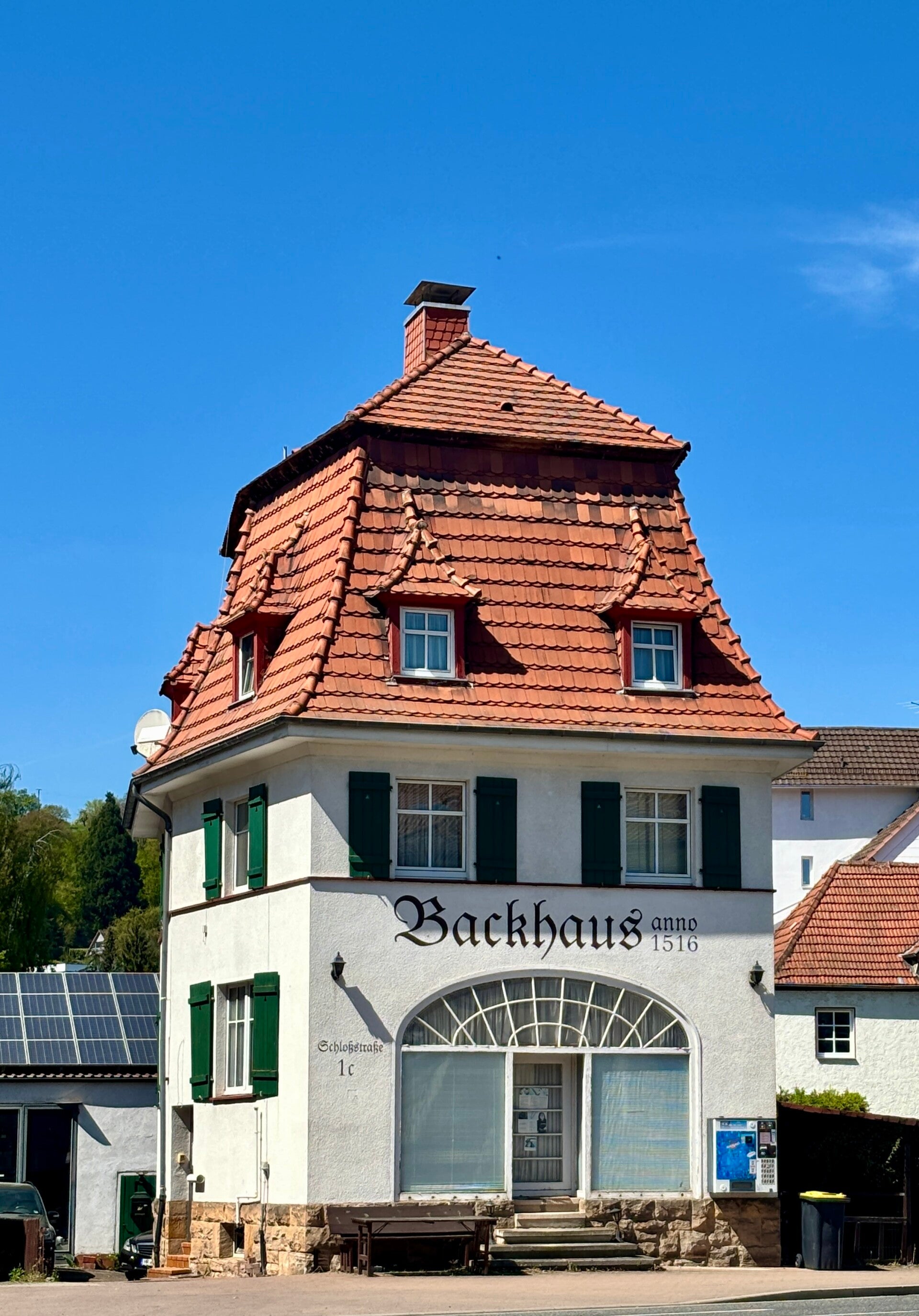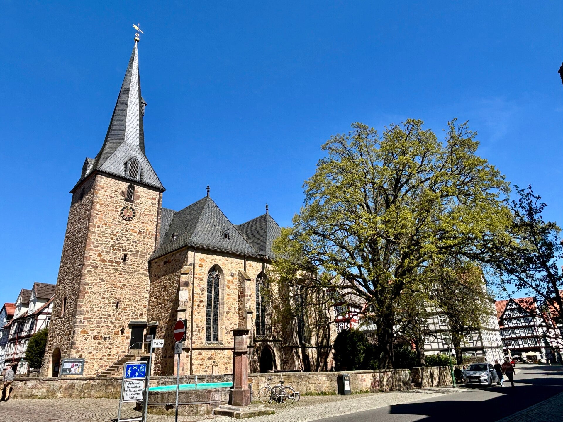 De route leidt ons over mooie fietspaden langs de rivier de Fulda en na het oversteken van de brug volgt een klein klim waar we toch moesten afstappen, ook op het kleinste verzet en de elektrisch motor op turbo kwamen we niet boven, dus met de fiets aan de hand kwamen we alsnog boven, hartslag boven de max dus het sportmomentje is ook weer geweest. Nadat onze hartslag weer tot een acceptabel niveau was gedaald rijden we weer door de velden met aardappel (wat ze hier in Duitsland Koolzaad noemen). Uiteindelijk belanden we na zo'n 10 kilometer fietsen in het dorp, zetten onze fietsen neer aan het begin van de winkelstraat, alles supergoed op slot wat onze Duitse medemens heeft wat met fietsen, de honden uit de cabrio en we struinen de stad in.