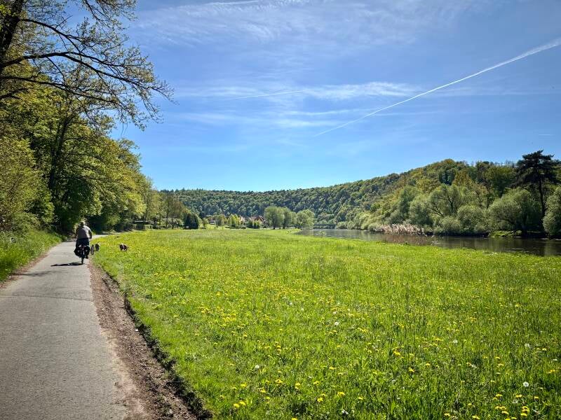 Na de lunch, een heerlijke verse snert, gaan we de spullen klaar maken om naar Guxhagen te gaan. Met als doel boodschappen en kijken wat er nog meer is vertrekken we, de honden gaan in de cabrio want na een slapeloze nacht zijn ze allebei niet erg fit. We fietsen langs de Fulda en genieten van de zon die volop schijnt, het wordt vandaag ongeveer 16 graden ☀️ en onbewolkt we hebben dan ook verder niets bij aan regenjassen of gewone jassen, gelukkig is het maar 2,7 km dus mocht het te gek worden zijn we zo terug 😜.